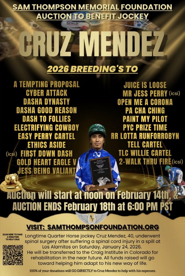 Longtime Quarter Horse jockey Cruz Mendez, 40, underwent spinal surgery after suffering a spinal cord injury in a spill at Los Alamitos on Saturday, January 24, 2026 according to the Daily Racing Form.